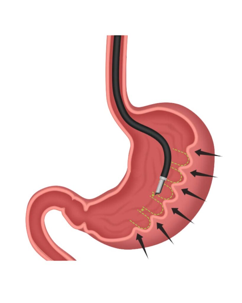 - São realizadas suturas, ou costuras, numa região do estômago denominada “grande curvatura”. Conforme estas suturas vão sendo apertas e fixadas, o estômago é remodelado e seu volume total reduzido.